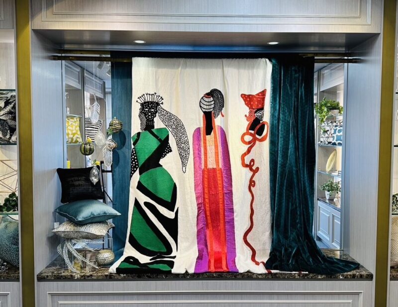 色鮮やかな民族衣装を纏った女性たちがパレードする姿が、繊細かつ大胆な刺繍で描かれています。